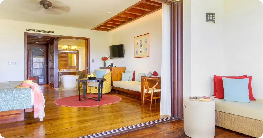 استيقِظ على مشهد أشجار جوز الهند المتمايلة ومياه المسبح الهادئة والمحيط الرائع في الخلفيّة. تُضفي الشرفة الخشبيّة الواسعة أجواءً من الودّ لتتلذّذ بوجبات فطور فاتنة ووجبات عشاء خاصّة مُضيئة ولحظات من الاسترخاء، بينما تتأمّل غروب الشمس الخالد في موريشيوس.