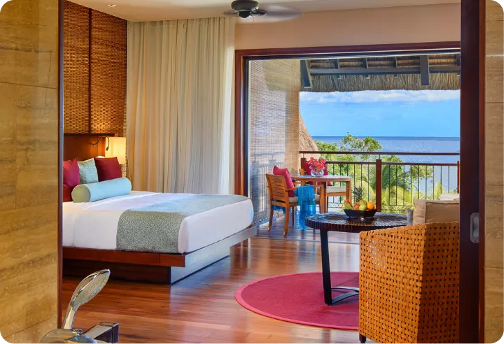 这是风格别致且明亮通风并内带私人花园的一楼式套房,旁边则是一个宽敞的木制阳台,完美地扩展了其内部活动空间,并且结合室内外为更和谐的活动空间奠定了基调。海滨居所的特色则是较为引人注目且开放式的一个设计风格,其包括采用精美的木材,大理石并且纯手工堆砌的石墙,以及优雅精致的家具,还摆放一张欧式特大床或两张双人床。